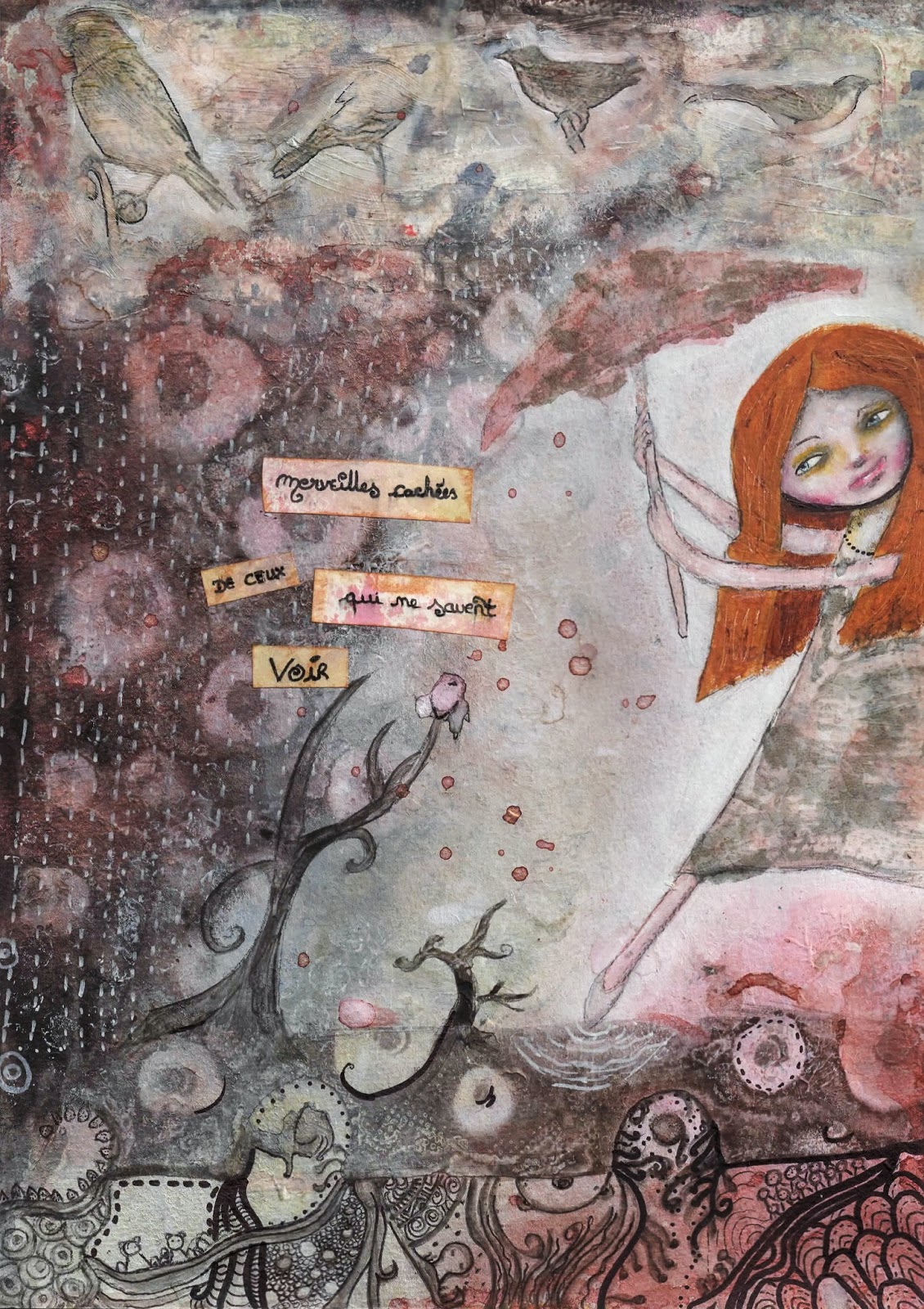 And then… I forget to take pictures… ooops! I’ve used diluted black and add some ribbing alcohol. I’ve protected the birds with petroleum jelly. For the girl : pastel and acrylique. On the dress and umbrella transfert of french tissue. Then, I’ve lot of fun with doodling some crearures of the underground.