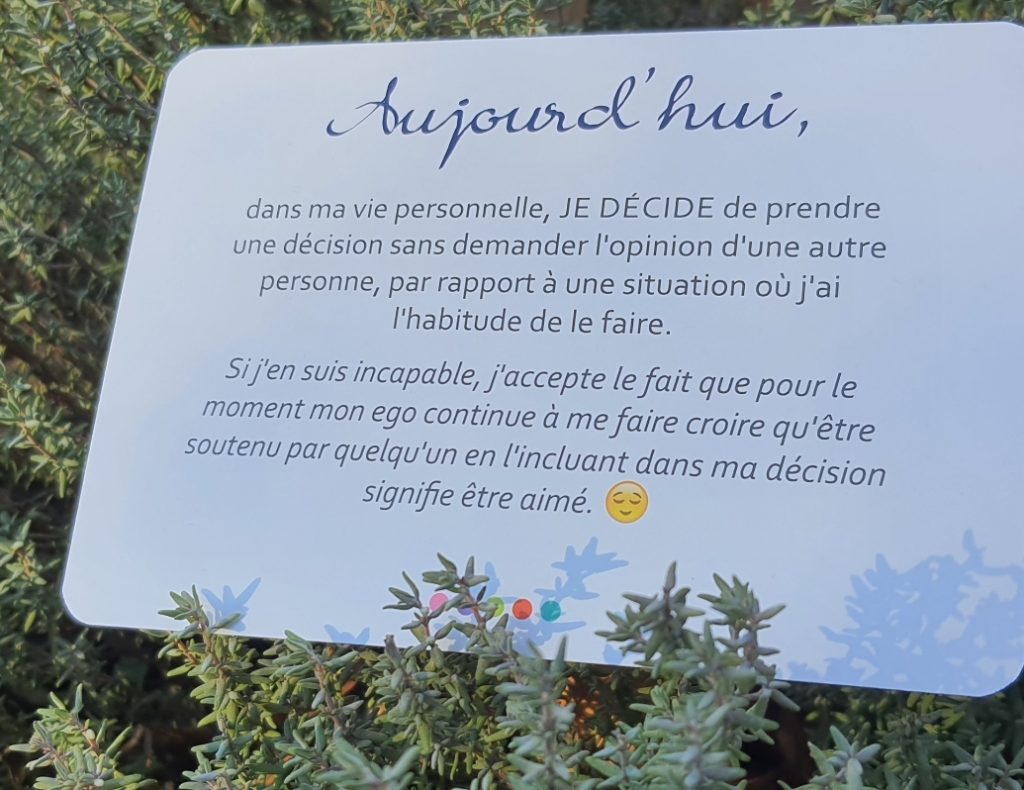 Prononcer les 4 affirmations tour à tour et dans cet ordre, en les ressentant toutes, jusqu’au fond de vous :
