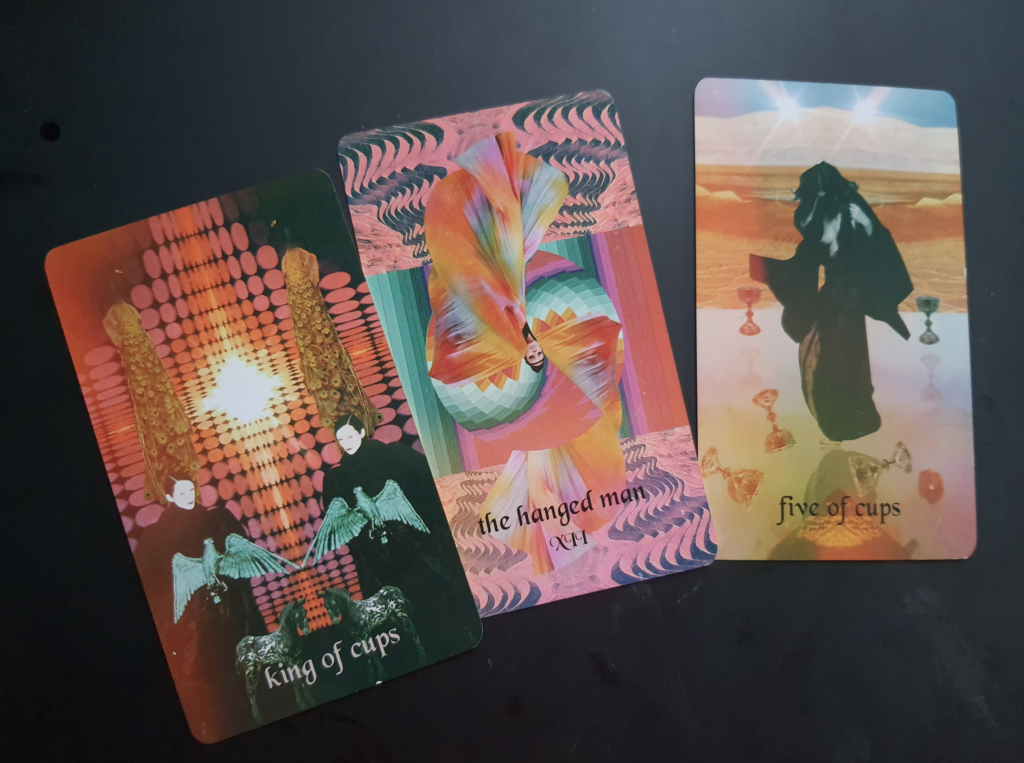 1- Le 5 de coupe (tout à droite) est une carte qui montre que l’on se focalise sur les émotions négatives, les déceptions, les deuils, …