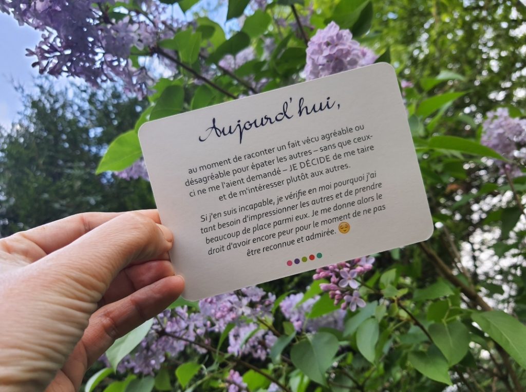 Autre affirmation de cette carte : « s’il y a un problème qui vous tracasse, adressez-le avec bienveillance pour transmuter son pouvoir »…. ouh…. pas simple ! Et justement, je me rends compte que lorsque la confiance n’est plus, je n’arrive plus à parler à l’autre. C’est un défi que de réussir à exposer avec bienveillance nos limites quand la blessure est activée. Cela explique que la colère est parfois telle, que l’on se tait et se renferme. Mais qu’est-ce que ça bouillonne à l’intérieur.